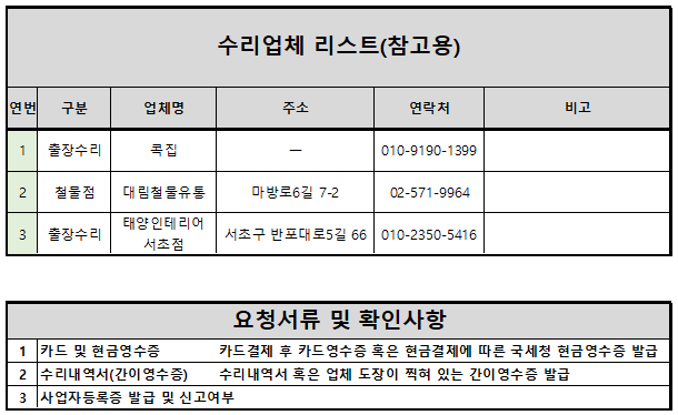 또한 지출에 대한 증빙으로 결제영수증 외에 업체 도장이 찍힌 수리내역서도 필수로 필요합니다.
